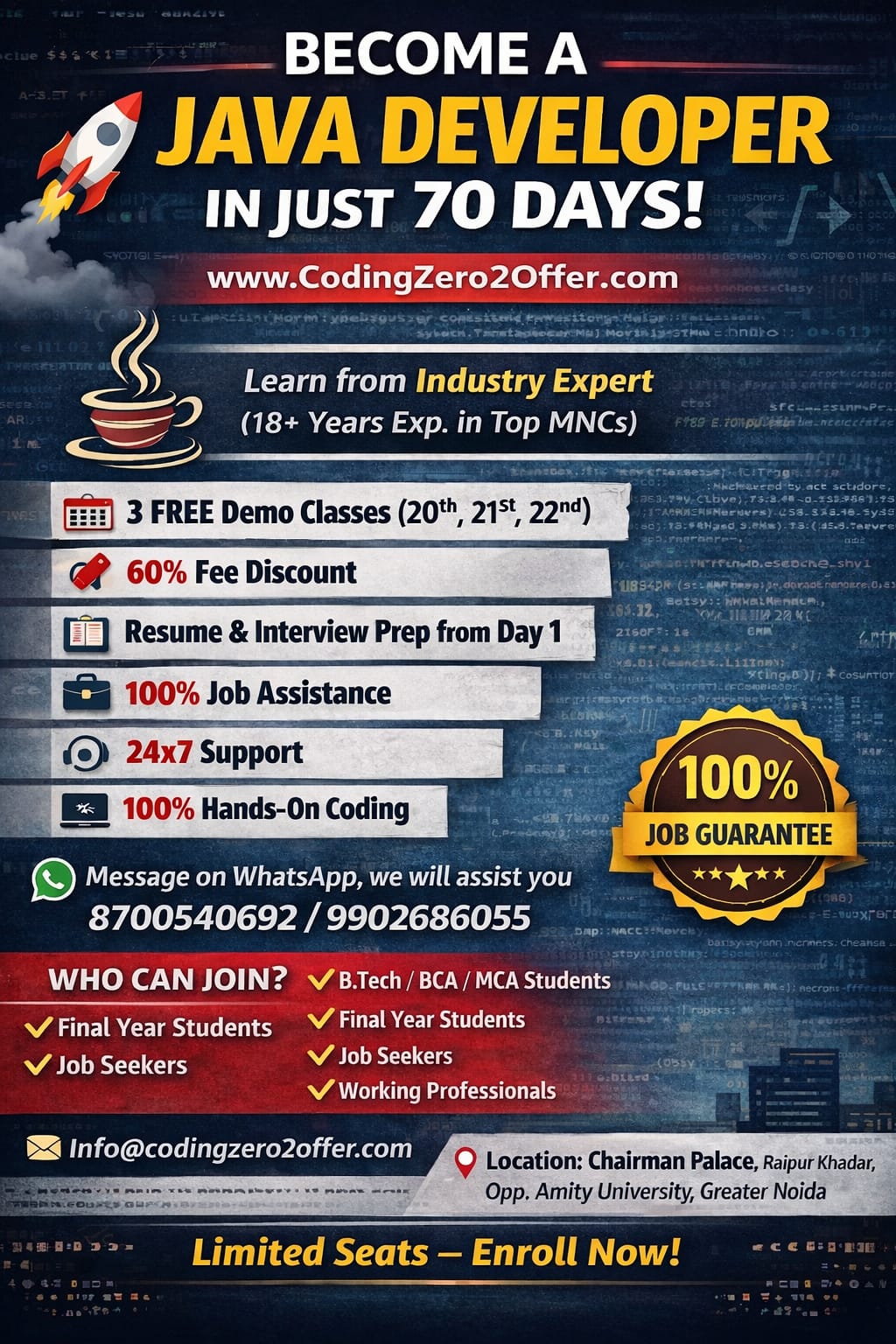 Whether you are a beginner or looking to upgrade your skills, CodingZero2Offer provides the perfect learning environment. Gain practical knowledge, work on live projects, and prepare for successful placement opportunities.